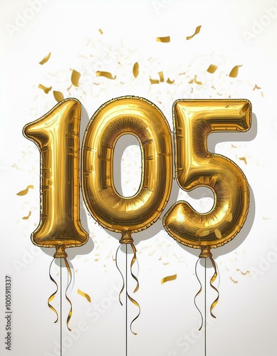 Gold birthday / anniversary balloon, number 105, white background with confetti