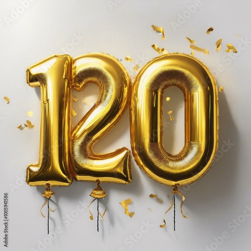 Gold birthday / anniversary balloon, number 120, white background with confetti
