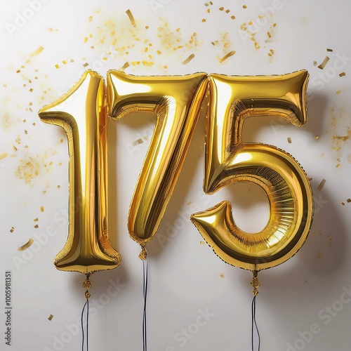 Gold birthday / anniversary balloon, number 175, white background with confetti