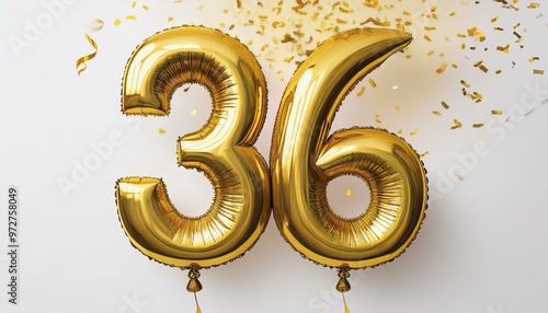 Gold birthday / anniversary balloon, number 36, white background with confetti