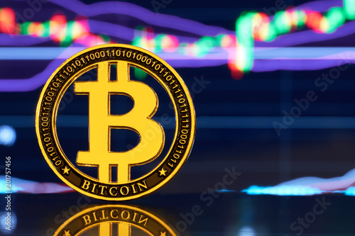 Gold coin bitcoin stacked on a bright background of business graphics close-up. Bitcoin crypto-currency. Virtual currency BTC