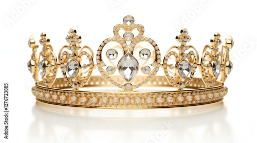 Gold crown isolated on white background, intricately designed with delicate filigree, embedded with radiant gemstones, reflecting regal elegance and luxury.