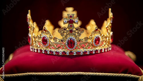 gold, crown, red, ruby, gem, velvet, cushion, image, gem, regal, royals, monarchy, king, queen, power, luxury, ornate, precious, majestic, jewellery, diadem, treasure, rich, red velvet