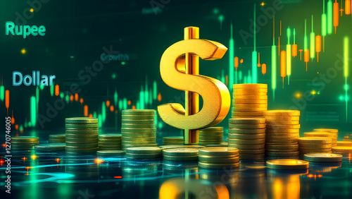Gold dollar currency 3d sign money finance investment business market on economy financial chart growth trade exchange stock graph background of global wealth diagram cash rate profit banking concept.