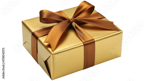 Gold Gift Box With Brown Ribbon isolated on a transparent background