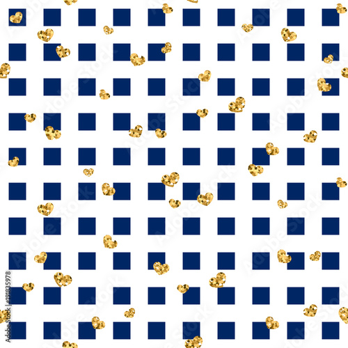 Gold heart seamless pattern. Blue-white geometric square, golden confetti-hearts. Symbol of love, Valentine day holiday. Design wallpaper, background, fabric texture. Vector illustration