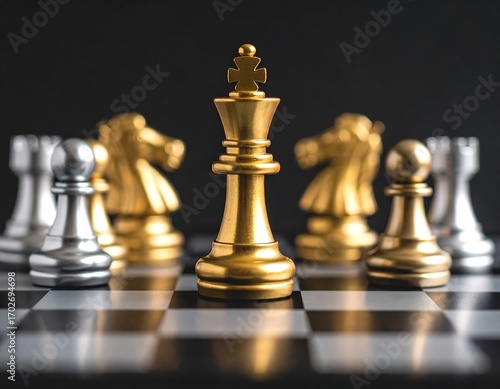 chess, king, gold, silver, piece, game, strategy, competition, board, black, white, dark, light, focused, closeup, strategic, tactical, leadership, victory, opposition, power, powerhouse, decision, risk, thought, analysis, positioning, movement, challenge, conflict