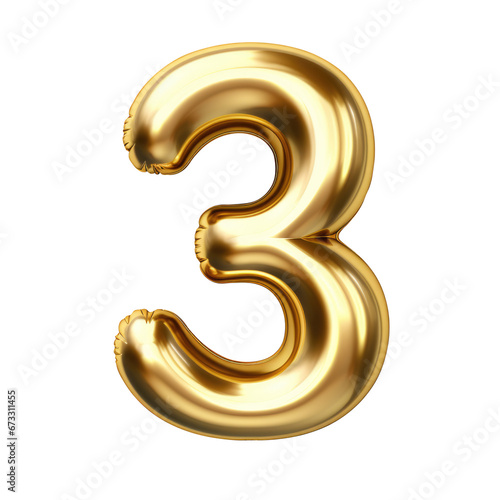 Gold metallic Number "3" balloon Realistic 3D on white background.