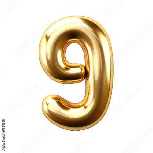 Gold metallic Number "9" balloon Realistic 3D on white background.