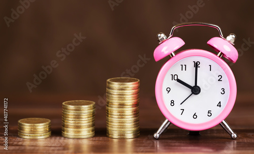 Gold money coin stacks with alarm clock, covid-19 pandemic financial stimulus aid package concept