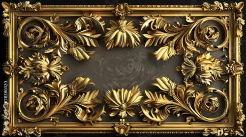 Gold relief frame featuring a floral pattern in baroque or rococo style. Ornate decorative relief frame. A golden baroque-style frame adorned with acanthus leaves and shell motifs.