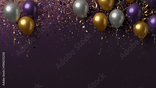 Gold, silver, and purple balloons with gold confetti on a dark purple background.