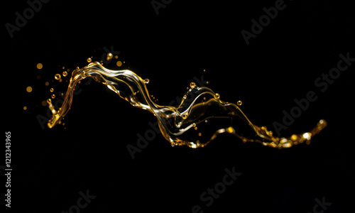 Gold splash with fluid motion against black background, creating elegant and dynamic visual effect. shimmering droplets enhance sense of movement and luxury