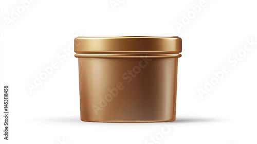 container, jar, metallic, gold, cylindrical, cardboard box, product, design, realistic, three-dimensional, render, shiny, brown, gold, lid, top, bottom, empty, storage, cosmetic, supplement, powder, food, drink, luxury, modern, simple, elegant, premium, smooth, glossy, reflective, illustration, graphic, vector, isolated, white, background, closed