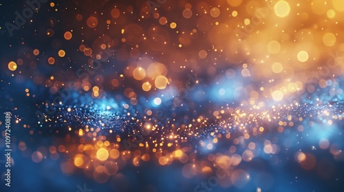 Golden and blue glittering bokeh lights on a dark background, evoking a magical and festive atmosphere.