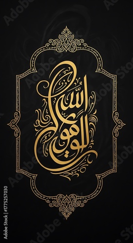 Golden Arabic Calligraphy on Black Background with Ornate Frame.