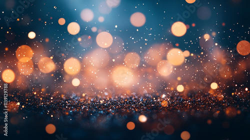 Golden bokeh confetti overlay with glowing yellow circles and sparkling dust creates a luxurious festive background with a blurred effect and empty blank space for a caption in the middle