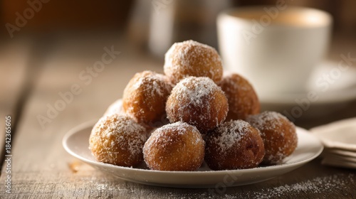 Golden brown donut holes with sugar dusting on a rustic wooden table