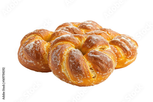 Golden brown sweet swirl pastries with sugar sprinkles isolated on transparent background. Delicious pretzels isolated on white background.