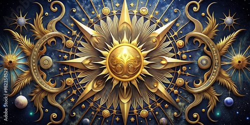sun, star, gold, space, celestial, cosmic, astronomy, galaxy, universe, planet, ornamental, gold, design, divine, spiritual, cosmos, astral, heavenly, circular, ray, radiant, pattern, glowing, ornate, delicate, artwork, mythology, mystical, fantasy, art, digital, three-dimensional, illustration, abstract, graphic, detailed, background, dark, blue, night, light, bright