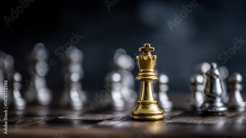 Golden chess king piece standing on dark wooden board with scattered silver pawns around, symbolizing power, strategy and business dominance in competitive market.