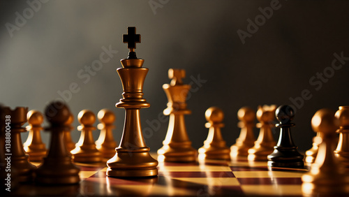 Golden chess pieces stand on a checkered board, with a single black pawn facing the opposing king. The scene is dramatically lit, emphasizing the strategic game.