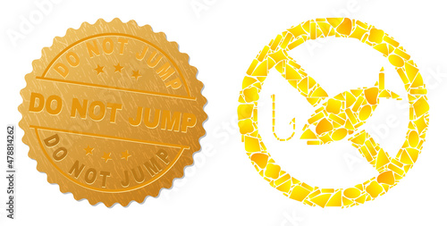 Golden collage of yellow elements for forbidden fishing icon, and golden metallic Do Not Jump stamp. Forbidden fishing icon collage is done with scattered gold parts.