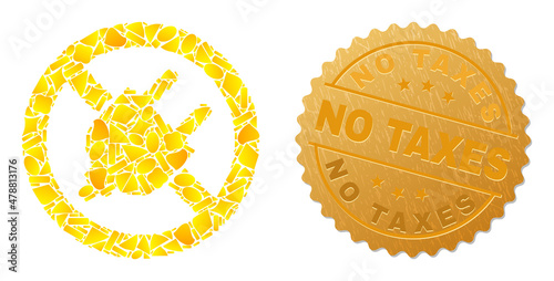 Golden collage of yellow spots for forbid electrical plugin icon, and golden metallic No Taxes stamp seal. Forbid electrical plugin icon mosaic is organized of scattered golden elements.