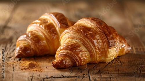 Golden croissants on wooden table high quality realistic image of buttery pastries in soft light