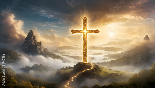 cross, mountain, sunrise, landscape, light, nature, scenery, faith, spirituality, cloud, sky, gold, tranquil, mist, symbolism, hope, peace, silhouette, horizon, rock, illumination, beauty, divine, calm, environment, sunbeam, pathway, radiance, contrast, majestic, artistic, vision, background, peaceful, worship, belief, inspiration, oneness, strength, journey, adventure, serene, aethereal, heavenly, depth, radiate, view