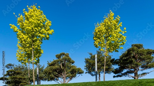 Golden crown of Norwegian Maple (Acer platanoides) Princeton Gold on background of blue sky. Beautiful spring yellow leaves. Public landscape city park "Krasnodar" or "Galitsky Park".