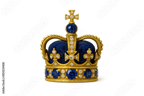 crown, royalty, monarchy, regal, power, empire, kingdom, king, queen, royals, coronation, symbol, authority, leadership, wealth, success, gold, gold, precious, gem, gemstone, diamond, sapphire, blue, rich, valuable, luxury, opulent, ceremonial, historic, ancient, tradition, ornate, elegant, elaborate, display, object, cut-out, front, view, nobody, studio, shot, close, up, transparent, background, isolated, white