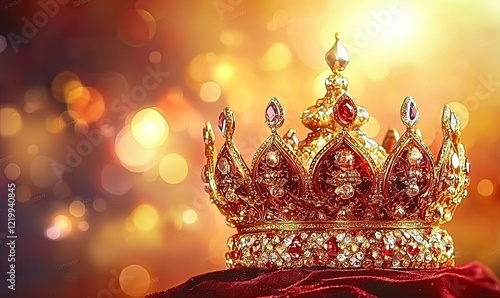 Golden crown with red jewels on velvet, bokeh background, fit for royalty, leadership, power
