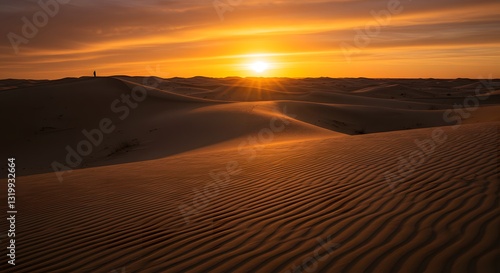 desert, sand, dune, sunset, landscape, golden hour, silhouette, figure, standing, horizon, huge, empty, warm, orange, yellow, light, nature, outdoors, travel, adventure, exploration, remote, solitude, peace, calmness, scenic, dramatic, background, wallpaper, photo, tour tourism, destination, evening, sky, cloud, sun, windswept, arid, barren