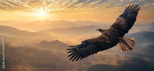 Golden eagle soars across misty mountains under a radiant dawn sky landscape