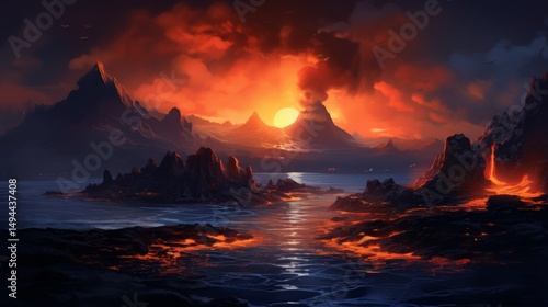 Golden evening sun dips below the serene mountain and sea horizon, painting the sky, clouds, and water with beautiful orange and red reflections