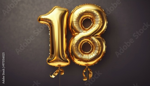 Golden foil balloon 18 floats in neutral space.