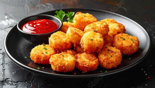 Golden fried mozzarella bites served with fresh tomato sauce on dark plate