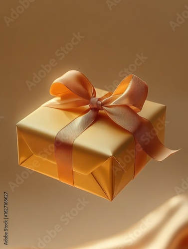 golden gift box wrapped with a shiny satin ribbon bow on a smooth beige background conveying elegance and celebration