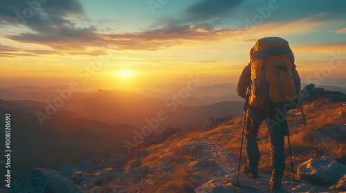 Golden Hour Hike: Silhouette of a Hiker on a Mountain Ridge at Sunset