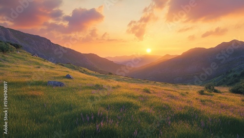 mountain, meadow, sunset, landscape, nature, gold, hill, sky, field, grass, sun, orange, cloud, summer, scenic, view, horizon, beautiful, peaceful, serene, calm, tranquil, twilight, evening, rural, wildflower, flora, light, ray, vibrant, colours, atmosphere, panorama, photo, wide, image, scenery, scene