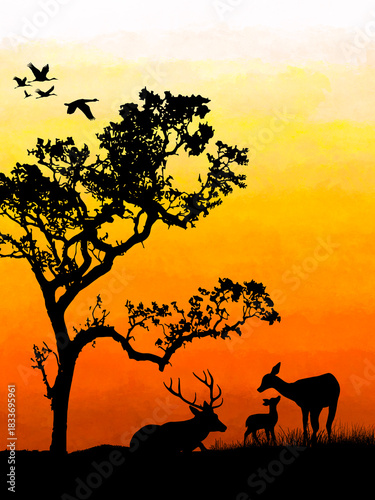 cervid, stag, fawn, wildlife, silhouette, sunset, forest, nature, golden hour, tranquil, serene