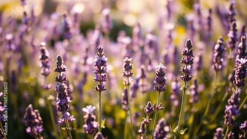 Golden Hour Lavender Field A close-up view of blooming lavender plants bathed in warm sunlight.