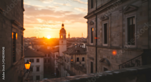 Golden Hour Sunset over Italian Hilltop Town, Bell Tower Silhouette