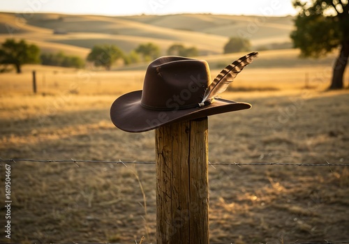 hat, cowboy, western, brown, leather, feather, post, fence, field, rural, countryside, landscape, sunset, sunlit, gold, dry, grass, hill, rolling, horizon, outdoors, nature, agriculture, farm, rustic, vintage, scenery