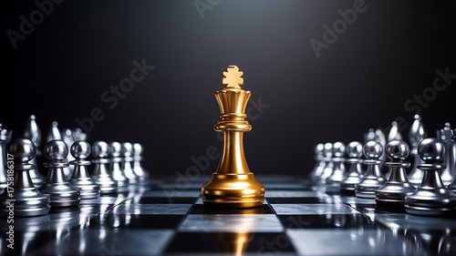 chess, king, gold, strategy, leadership, power, game, board, silver, competition, sharpened, spotlight, chequered, contrast, decision, dominance, logic, planning, challenge, move, tactic, authority, position, central, highlight, formation, opponent, visual, black, white, competitive, thinking, control, precision, elite, rule, command, mastery, confrontation, winning