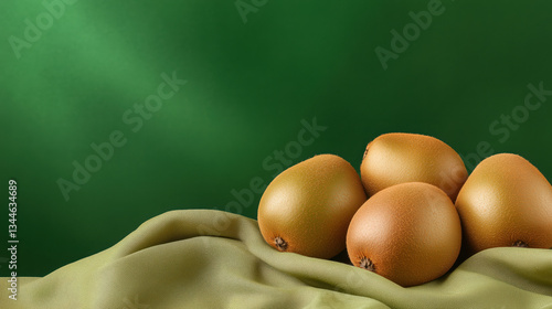 Golden kiwi fruits arranged on light green fabric against deep green background. Fresh produce concept for healthy nutrition, organic food marketing and tropical fruit displays