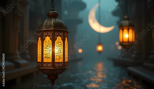 ramadan, lantern, crescent moon, islam, muslim, eid, night, light, gold, arabic, calligraphy, mosque, celebration, holy, month, fasting, prayer, tradition, culture, spiritual, faith, religion, festive, decoration, illuminated, glowing, serene, peaceful, background, greeting, card, design, oriental, religious holiday, middle east, arab, arabian