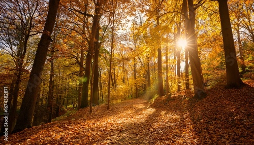 golden leaves flutter gently to the ground as a peaceful forest path reveals the beauty of autumn the sun filters through trees painting shadows and highlights on the earth below
