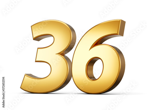 Golden metallic Number 36 Thirty six, White background 3d illustration